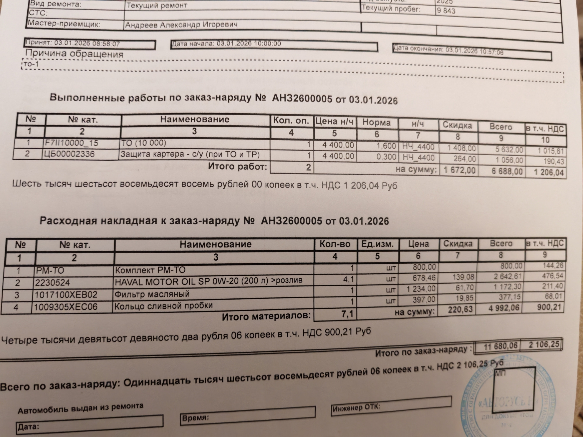 Здравствуйте! 07.01.2026 года проходил ТО-2 на Haval H3. Стоимость ТО - 15200 руб., зафиксированная по телефону при записи, никак не изменилась. По работам все хорошо, присутствовал в мастерской во время проведения работ. Все прошло четко, как и должно в хорошем тех. центре.